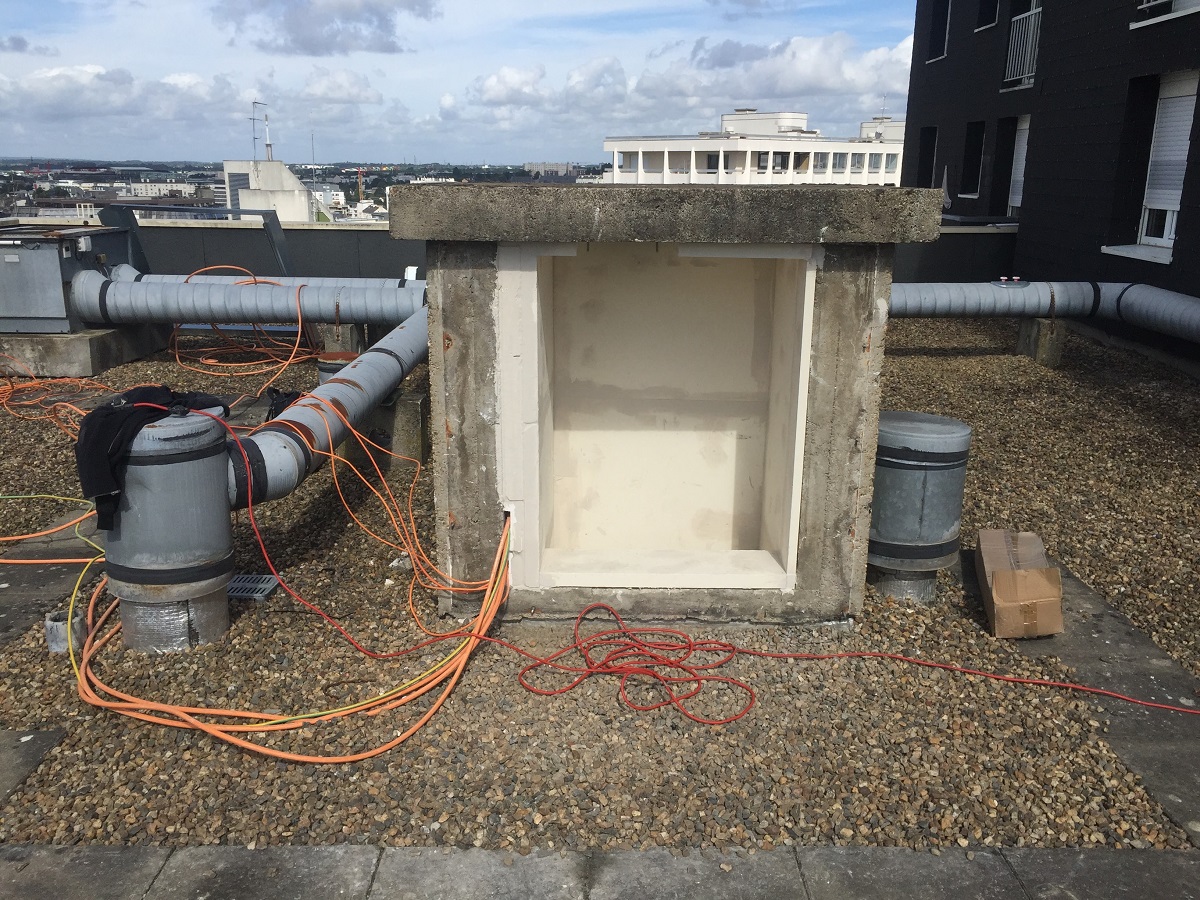 Pose de 3 ventilateurs de soufflage dans les sas, création des trémies dans la toiture.